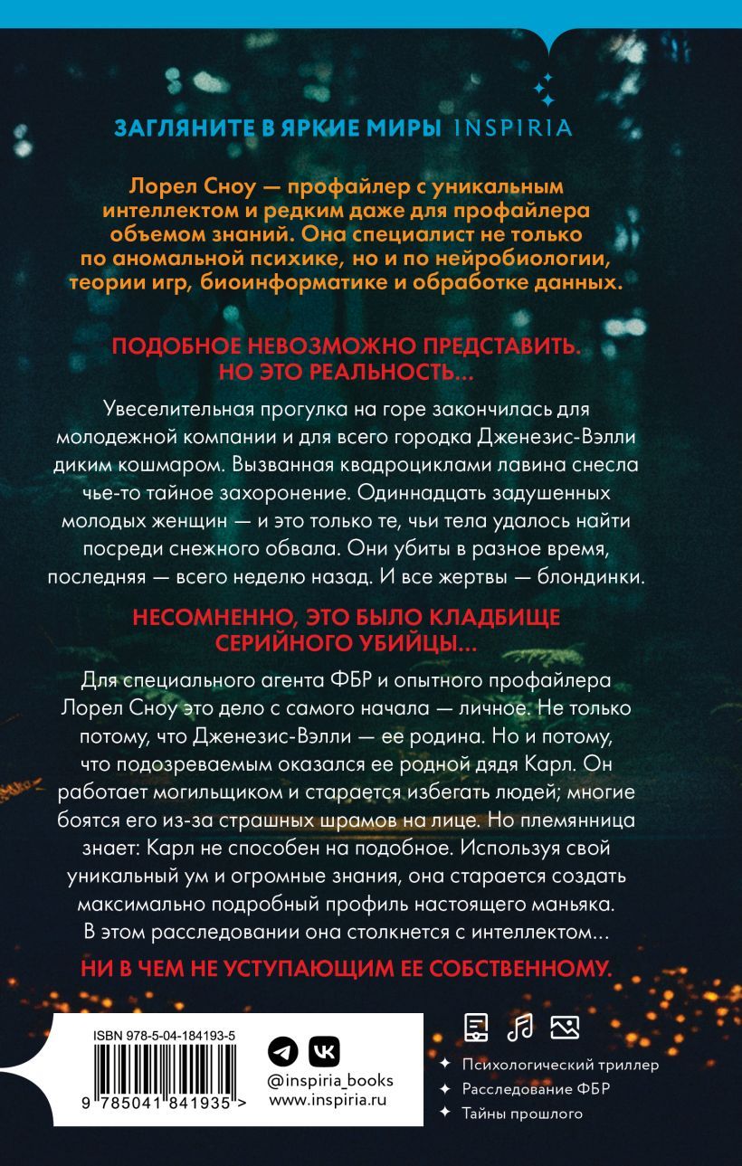 Подобное невозможно представить. Но это реальность… Увеселительная прогулка на горе закончилась для молодежной компании и для всего городка Дженезис-Вэлли диким кошмаром. Вызванная квадроциклами лавина снесла чье-то тайное захоронение. Одиннадцать задушенных молодых женщин — и это только те, чьи тела удалось найти посреди снежного обвала. Они убиты в разное время, последняя — всего неделю назад. И все жертвы — блондинки. Несомненно, это было кладбище серийного убийцы… Для специального агента ФБР и опытного профайлера Лорел Сноу это дело с самого начала — личное. Не только потому, что Дженезис-Вэлли — ее родина. Но и потому, что подозреваемым оказался ее родной дядя Карл. Он работает могильщиком и старается избегать людей; многие боятся его из-за страшных шрамов на лице. Но племянница знает: Карл не способен на подобное. Используя свой уникальный ум и огромные знания, она старается создать максимально подробный профиль настоящего маньяка. В этом расследовании она столкнется с интеллектом… Ни в чем не уступающим ее собственному.