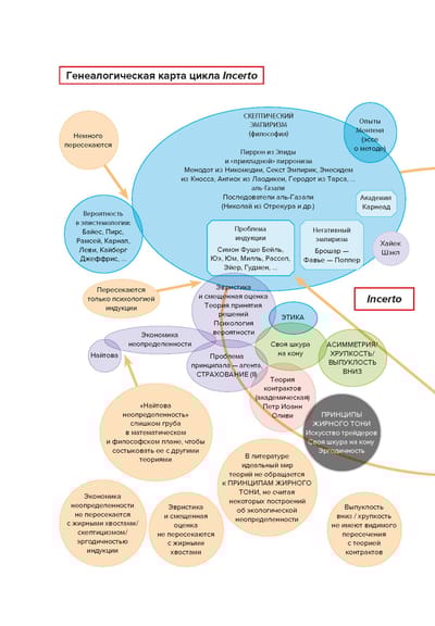 «Вероятность — не столько вычисление шансов при бросании костей, сколько признание недостатка определенности в наших знаниях и развитие методов обращения с нашим неведением. За пределами учебников и казино вероятность почти никогда не предстает в виде математической задачи или загадки для ума. Мать-природа не скажет вам, сколько лунок есть на столе для игры в рулетку, да и задачи она формулирует не в том стиле, который принят в учебниках (в реальном мире приходится искать проблему, а не решение). Вероятностное мышление, лежащее в основе этой книги, предполагает, что, если бы осуществились альтернативные исходы, мир был бы другим».(Н.Талеб)
