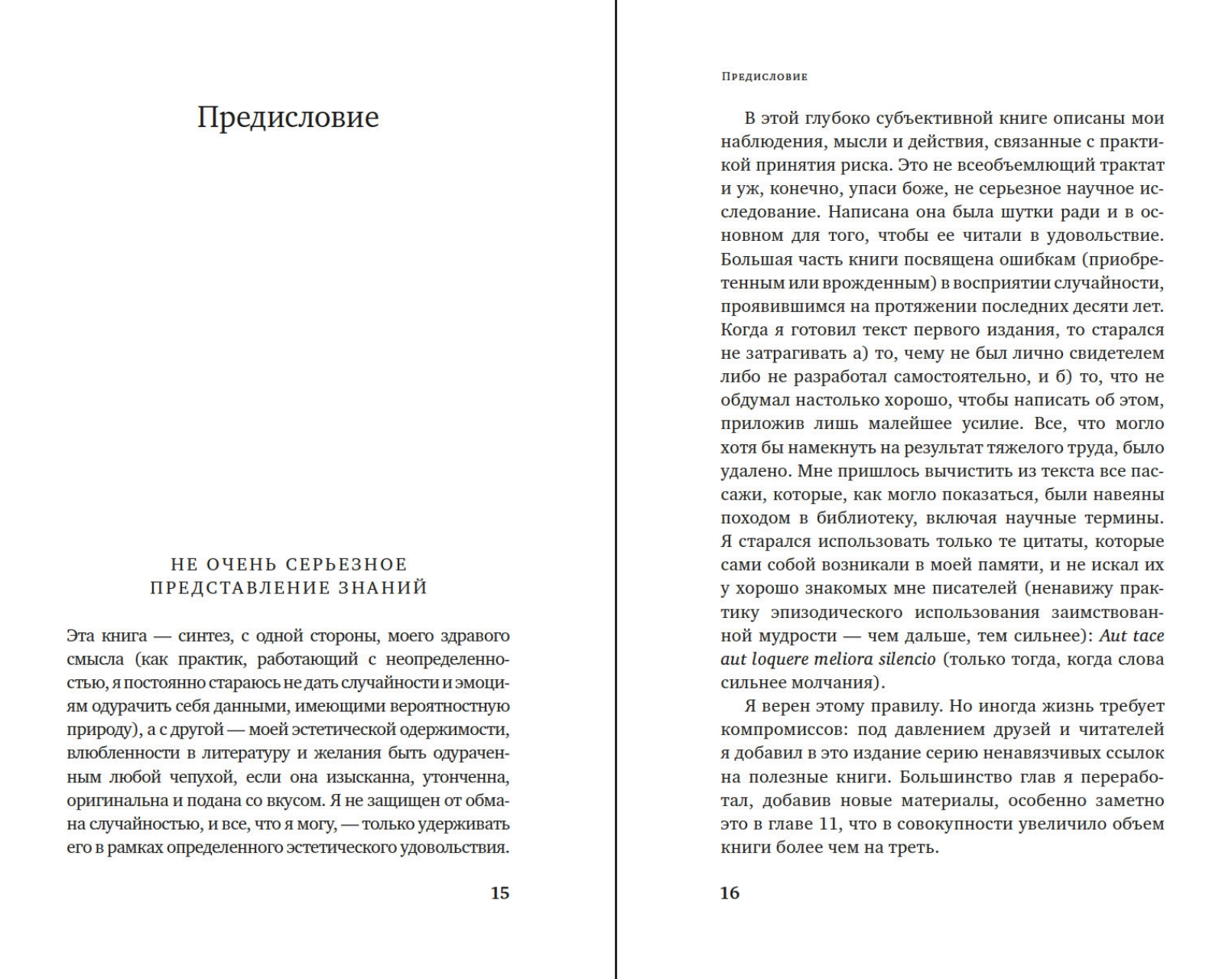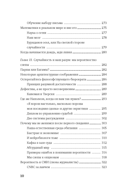 «Вероятность — не столько вычисление шансов при бросании костей, сколько признание недостатка определенности в наших знаниях и развитие методов обращения с нашим неведением. За пределами учебников и казино вероятность почти никогда не предстает в виде математической задачи или загадки для ума. Мать-природа не скажет вам, сколько лунок есть на столе для игры в рулетку, да и задачи она формулирует не в том стиле, который принят в учебниках (в реальном мире приходится искать проблему, а не решение). Вероятностное мышление, лежащее в основе этой книги, предполагает, что, если бы осуществились альтернативные исходы, мир был бы другим». (Н.Талеб)