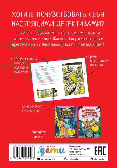 Гитта Огурчик и Калле Фасоль — сыщики. Их детективное агентство «Огурчик и Фасоль» известно во всём городе. Именно к ним обращаются, если происходит что-то странное или непонятное. Разгадайте вместе с детективами новые тайны, преступления и загадки небольшого городка. Для этого вам понадобится всё ваше внимание, логическое мышление и смекалка. Читайте истории, разглядывайте картинки и помните: мелочи — очень важны.