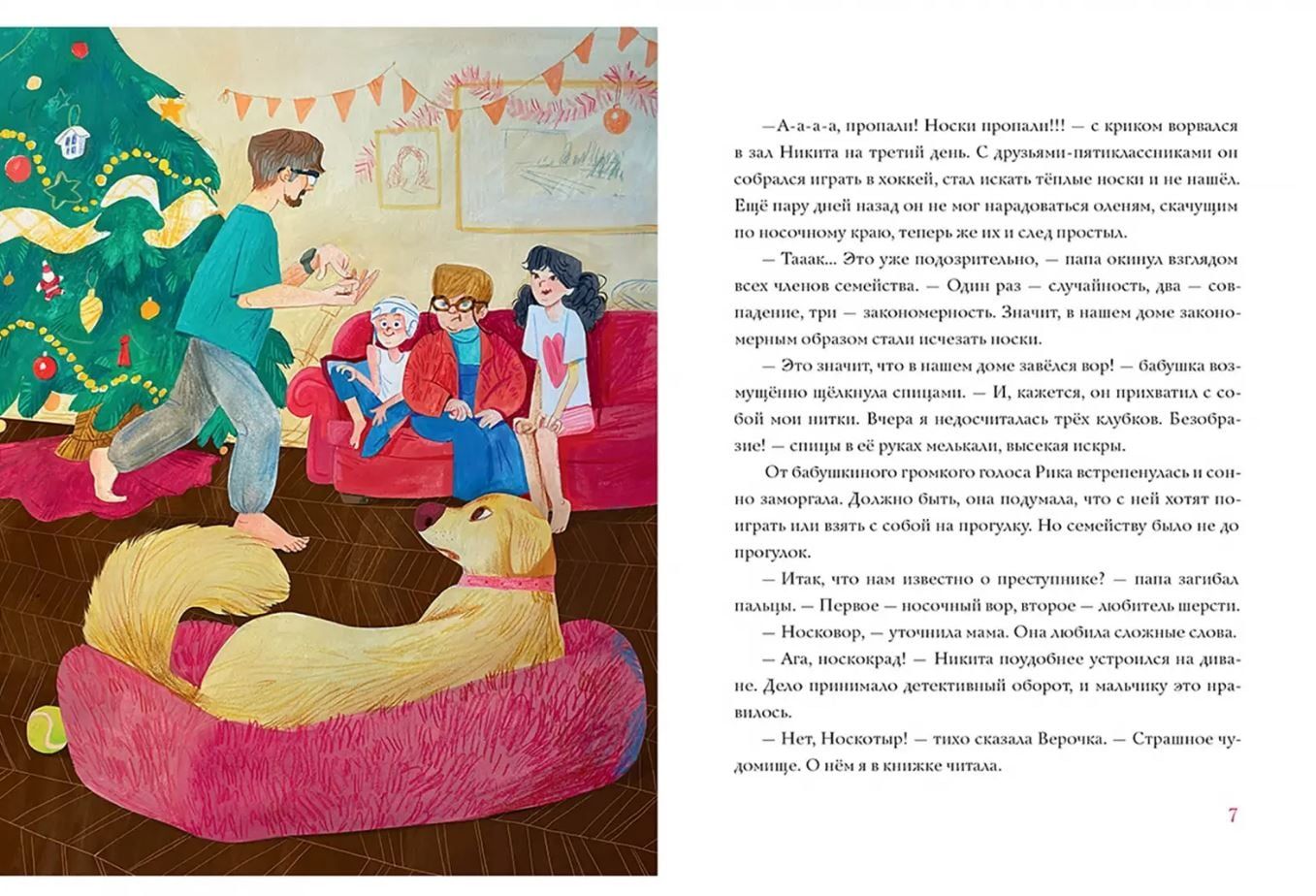 В одной дружной семье стали пропадать тёплые вязаные носки. Причём у всех поочерёдно — а потом исчезли и бабушкины клубки шерстяных ниток. Словно в доме завёлся таинственный зверь Носкотыр! Чего только не делали, чтобы Носкотыра отвадить, — мазали носки горчицей, посыпали перцем, даже хотели пустить по следу чудовища любимую собаку Рику. Но Рика и не подумала выслеживать воришку. Тогда на семейном совете было решено поймать хитрого зверя…