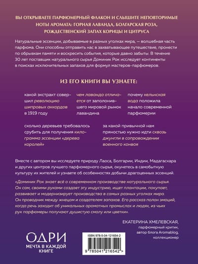 Вы открываете парфюмерный флакон и слышите неповторимые ноты аромата: горная лаванда, болгарская роза, рождественский запах корицы и цитруса. Натуральные эссенции, добываемые в разных уголках мира — волшебная часть парфюма. Они способны отправить нас в захватывающее путешествие, пронести по обрывкам памяти и воскресить события, которые давно забыты. В течение 30 лет поставщик натурального сырья Доминик Рок исследует континенты в поисках исключительных запахов для формул «мастеров-парфюмеров».