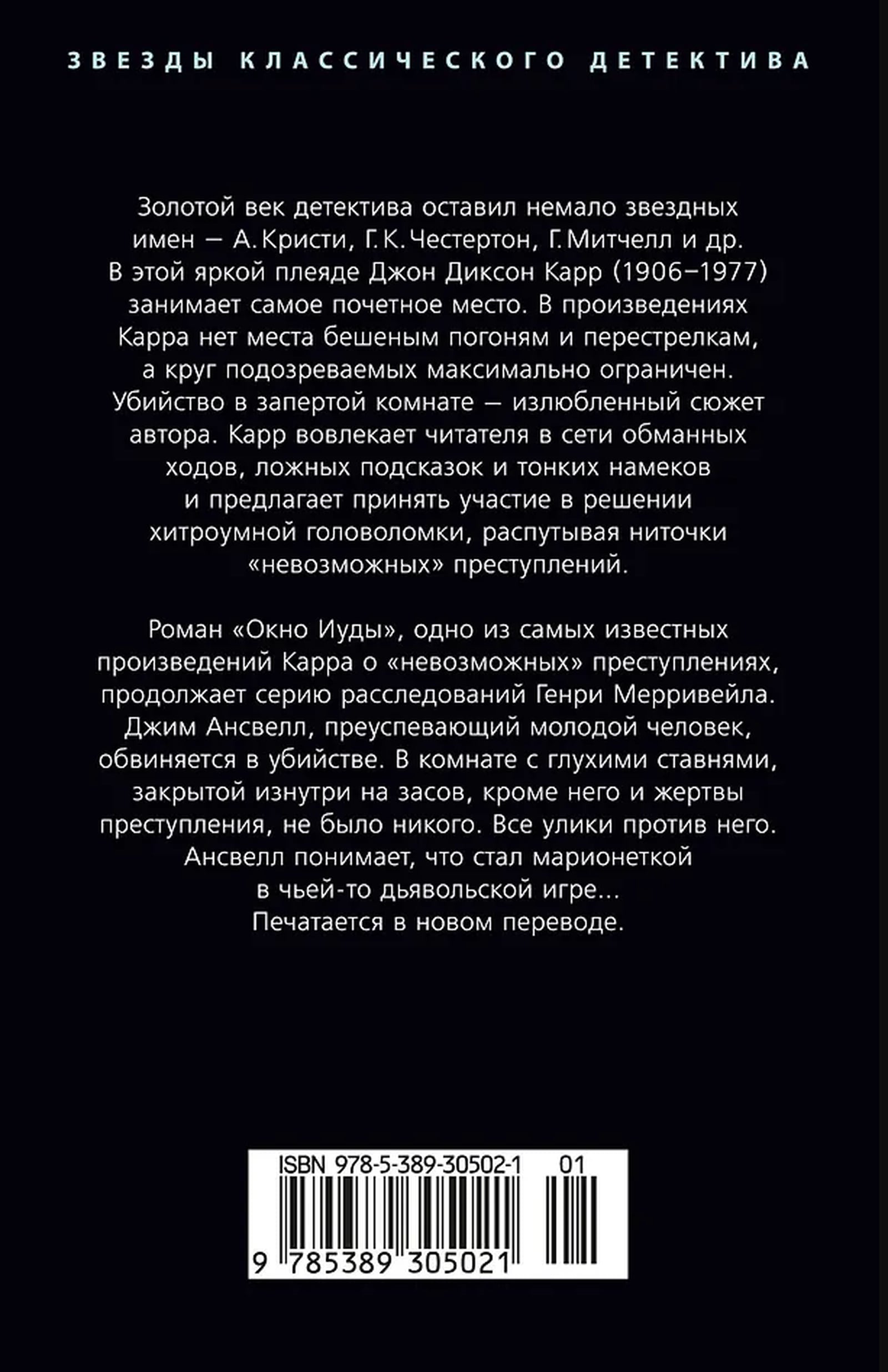 Золотой век детектива оставил немало звездных имен — А. Кристи, Г. К. Честертон, Г. Митчелл и др. В этой яркой плеяде Джон Диксон Карр (1906–1977) занимает самое почетное место. В произведениях Карра нет места бешеным погоням и перестрелкам, а круг подозреваемых максимально ограничен. Убийство в запертой комнате — излюбленный сюжет автора. Карр вовлекает читателя в сети обманных ходов, ложных подсказок и тонких намеков и предлагает принять участие в решении хитроумной головоломки, распутывая ниточки «невозможных» преступлений.
