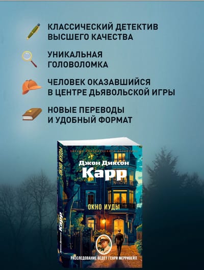 Роман «Окно Иуды», одно из самых известных произведений Карра о «невозможных» преступлениях, продолжает серию расследований Генри Мерривейла. Джим Ансвелл, преуспевающий молодой человек, обвиняется в убийстве. В комнате с глухими ставнями, закрытой изнутри на засов, кроме него и жертвы преступления, не было никого. Все улики против него. Ансвелл понимает, что стал марионеткой в чьей-то дьявольской игре...