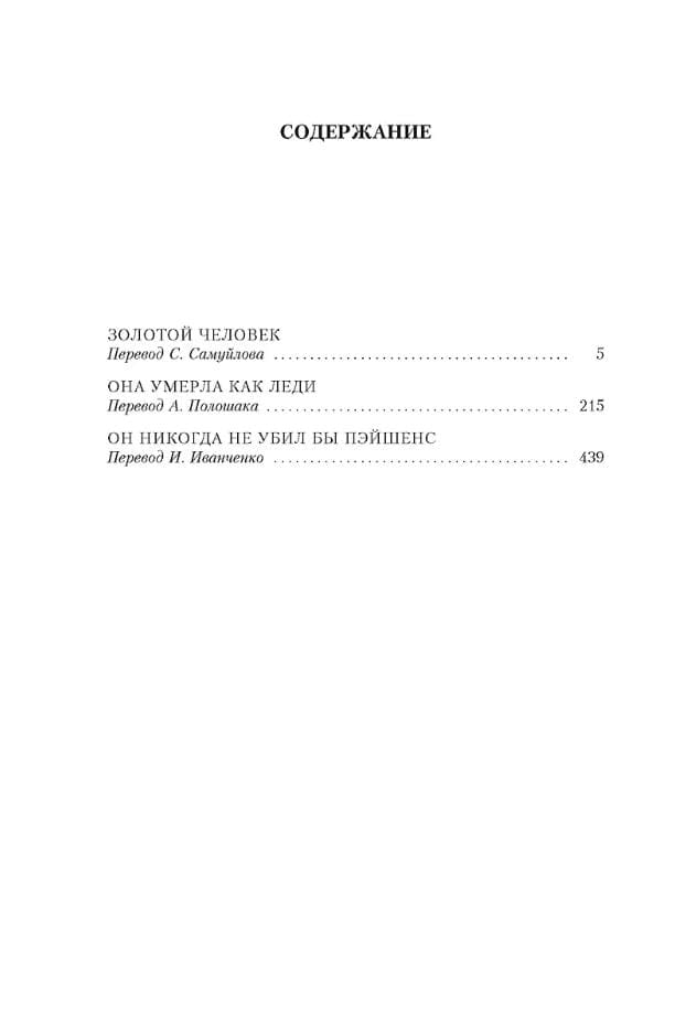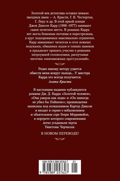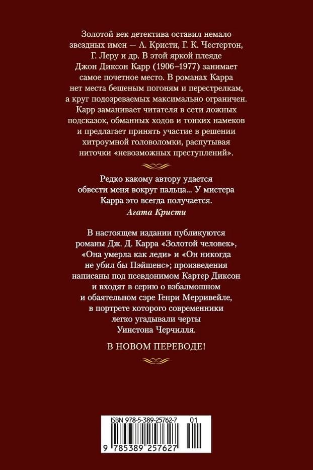 В настоящем издании публикуются романы Дж. Д. Карра «Золотой человек», «Она умерла как леди» и «Он никогда не убил бы Пэйшенс»; произведения написаны под псевдонимом Картер Диксон и входят в серию о взбалмошном и обаятельном сэре Генри Мерривейле, в портрете которого современники легко угадывали черты Уинстона Черчилля.