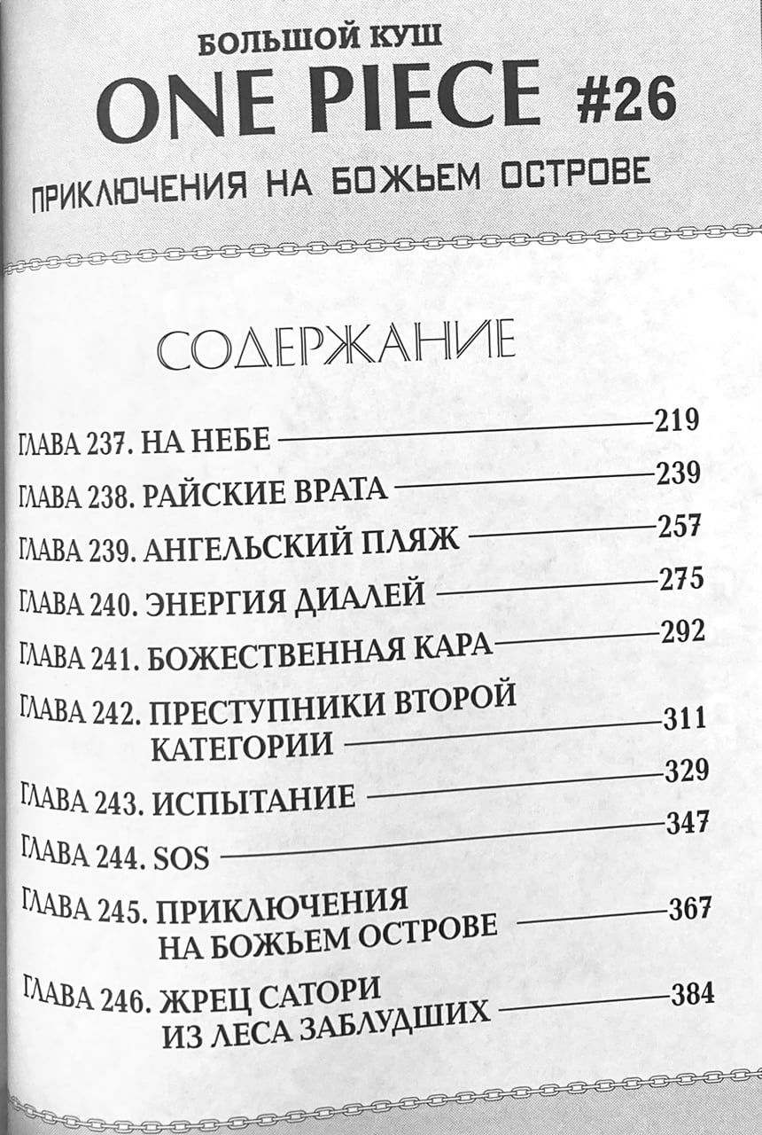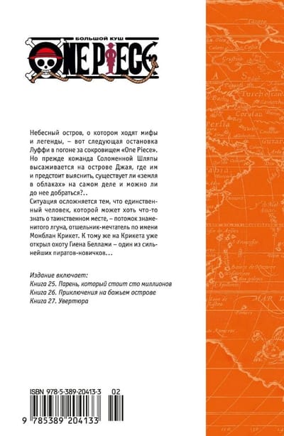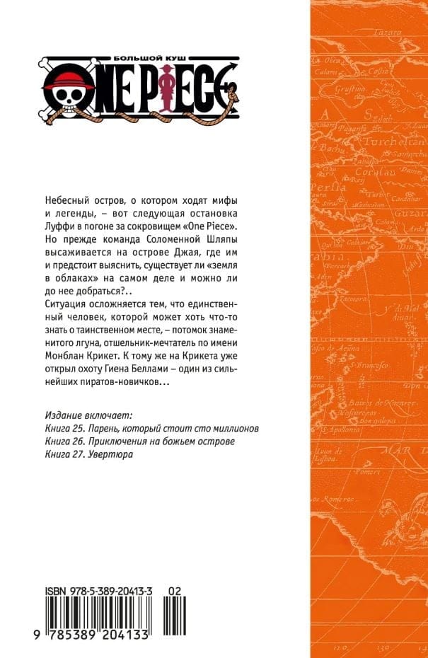 Небесный остров, о котором ходят мифы и легенды, – вот следующая остановка Луффи в погоне за сокровищем «One Piece». Но прежде команда Соломенной Шляпы высаживается на острове Джая, где им и предстоит выяснить, существует ли «земля в облаках» на самом деле и можно ли до нее добраться?.. Ситуация осложняется тем, что единственный человек, которой может хоть что-то знать о таинственном месте – потомок знаменитого лгуна, отшельник-мечтатель по имени Монблан Крикет. К тому же на Крикета уже открыл охоту Гиена Беллами – один из сильнейших пиратов-новичков на Гранд-Лайне...