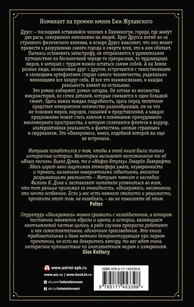 Это роман-лабиринт, роман-загадка. Он соткан из множества микроисторий, из сотен деталей, которые свиваются в один большой сюжет. Здесь важна каждая подробность, здесь перед читателем предстает невероятное количество разнообразных, ни на что не похожих миров, народов, сказаний и представлений, а каждое предложение может стать ключом к пониманию причудливого многомерного пространства, в котором сплетаются фэнтези и хоррор, альтернативная реальность и фантастика, «новые странные» и сюрреализм. Это «Оникромос», книга, подобной которой вы еще не встречали.