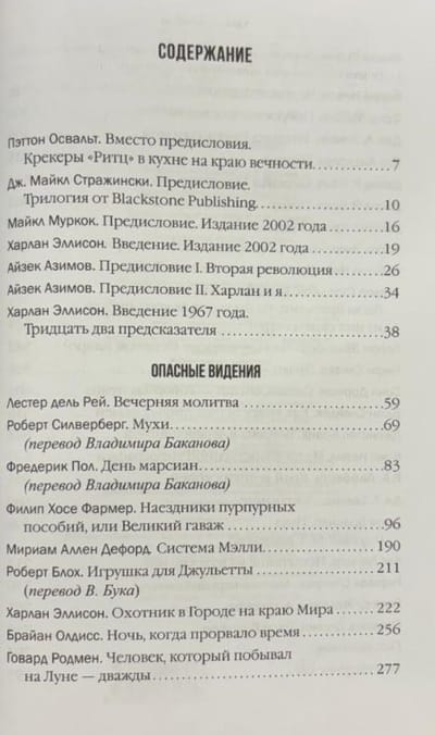 Антологии редко творят историю, но «Опасные видения» — великое и удивительное исключение. В далеком 1967 году, во время студенческих волнений, бесславной войны во Вьетнаме и психоделической революции, писатель и редактор Харлан Эллисон совершил настоящую культурологическую провокацию. Он попросил ведущих фантастов своего времени написать для составляемого им сборника по рассказу, который бы выражал истинное, «опасное» видение будущего и поэтому принципиально не мог быть опубликован в то время. А перечень авторов действительно впечатлял: Айзек Азимов, Филип К. Дик, Роджер Желязны, Пол Андерсон, Роберт Силверберг, Филип Хосе Фармер и другие.
