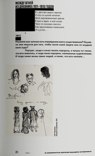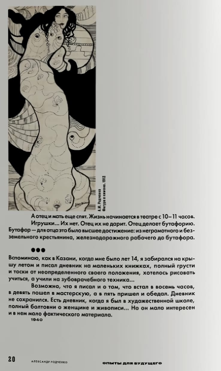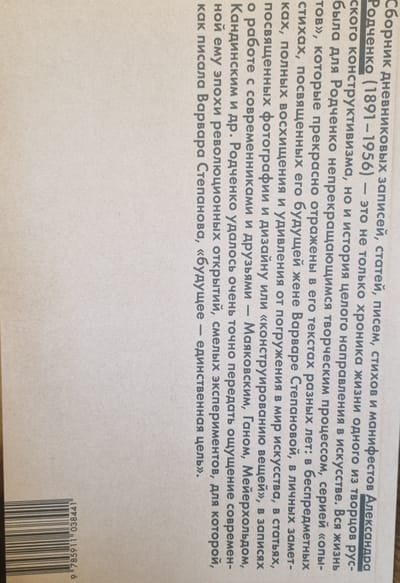 Сборник дневниковых записей, статей, писем, стихов и манифестов Александра Родченко (1891–1956) — это не только хроника жизни одного из творцов русского конструктивизма, но и история целого направления в искусстве. Вся жизнь была для Родченко непрекращающимся творческим процессом, серией «опытов», которые прекрасно отражены в его текстах разных лет: в беспредметных стихах, посвященных его будущей жене Варваре Степановой, в личных заметках, полных восхищения и удивления от погружения в мир искусства, в статьях, посвященных фотографии и дизайну или «конструированию вещей», в записях о работе с современниками и друзьями — Маяковским, Ганом, Мейерхольдом, Кандинским и др. Родченко удалось очень точно передать ощущение современной ему эпохи революционных открытий, смелых экспериментов, для которой, как писала Варвара Степанова, «будущее — единственная цель».