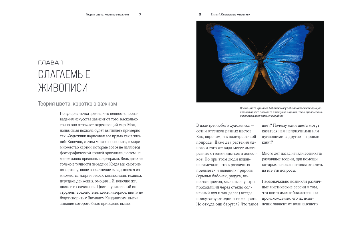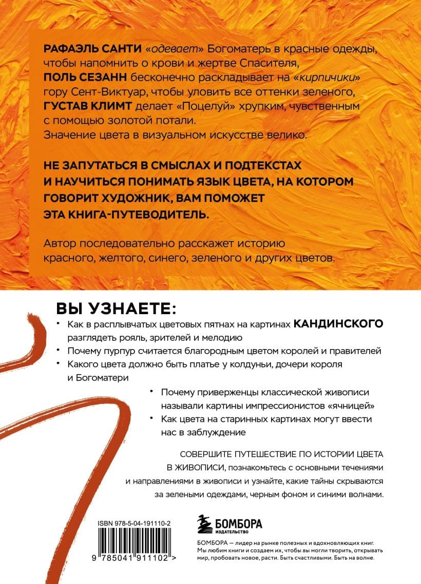 Автор подробно разбирает историю красного, желтого, синего, зеленого и других цветов на примере известных картин: «Мона Лиза», «Портрет четы Арнольфини», «Девушка с жемчужной сережкой», «Поцелуй», «Звездная ночь», «Рождение Венеры».