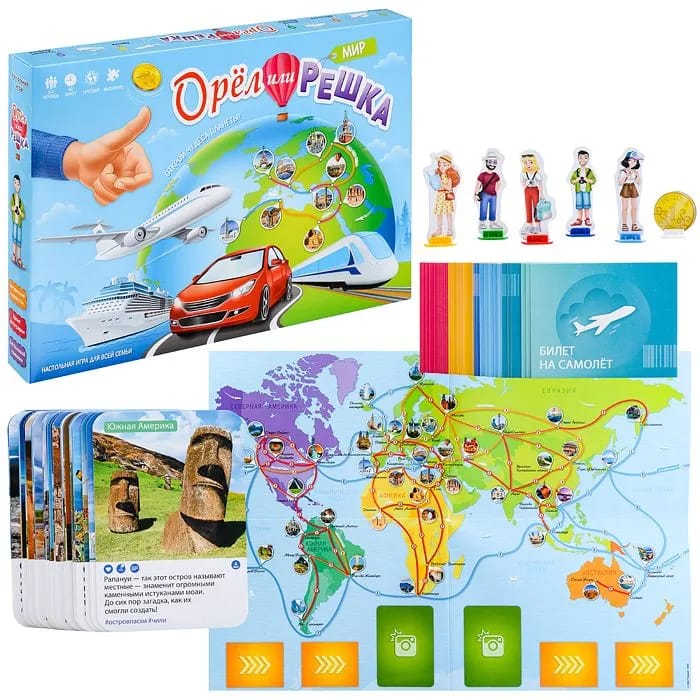 Как увидеть мир своими глазами в современной ситуации? С нашей настольной игрой «Орел или решка» - легко! Отправляйтесь в кругосветное путешествие прямо сидя на диване. Игроков ждут билеты в разные города и страны мира, восхитительная природа и грандиозные памятники архитектуры. Чтобы добраться до цели, нужна не только удача, но и самая настоящая стратегия. Интересная и понятная механика только увеличит шансы насладиться путешествием!