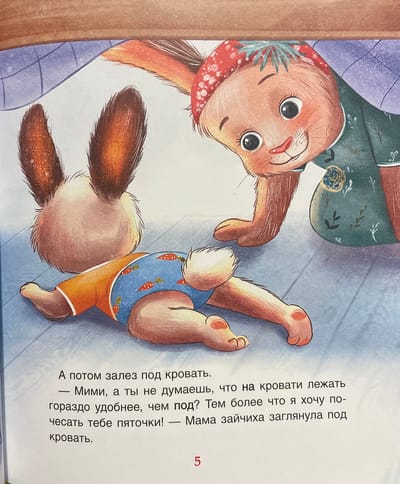 Пора спать, а зайчонок Мими совсем не хочет укладываться в кроватку! Мама уже и покушать ему принесла, и попить дала, и даже песенку спела, а Мими всё не ложится.