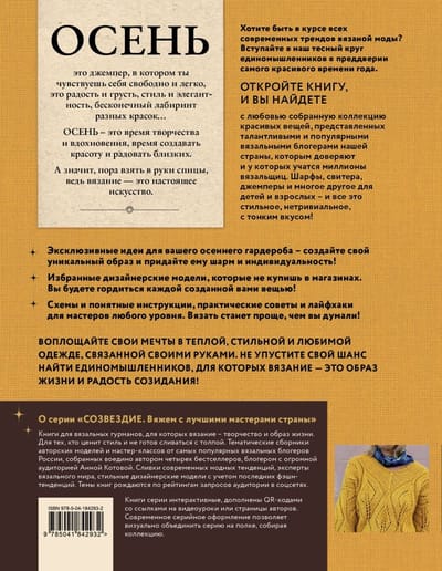 Уникальная книга в уникальной серии! Впервые авторские вязальные проекты от лучших мастеров России тщательно отобраны авторитетным экспертом, мастером, автором бестселлеров по вязанию Анной Котовой и представлены в одной книге! Самые авторитетные мастера-блогеры, чье имя на слуху российских и не только мастериц-вязальщиц, по чьим мастер-классам обучаются вязать тысячи и тысячи учеников во всем мире, предоставили свои роскошные авторские модели в эту красивую осеннюю книгу. Осенью хочется ярких красок, тепла и уюта, и совсем не хочется шарить по интернету в поисках того, чтобы связать себе, детям, мужу... В этой книге вы найдете красивые проекты на любой вкус, от джемперов до шапок для взрослых и детей. И создадите для них стильный, яркий, уютный гардероб, в котором так хорошо гулять золотой осенью! Вы и ваша семья достойны самого лучшего. Готовимся к осени вместе со звездами российского вязания!