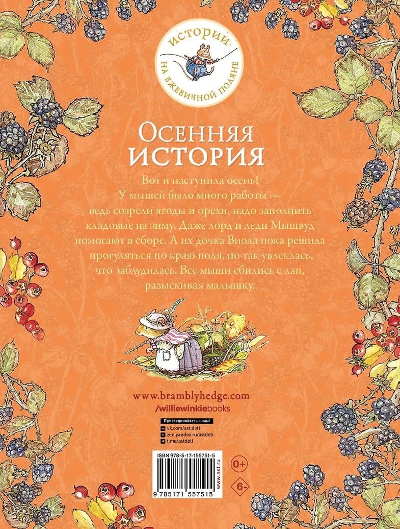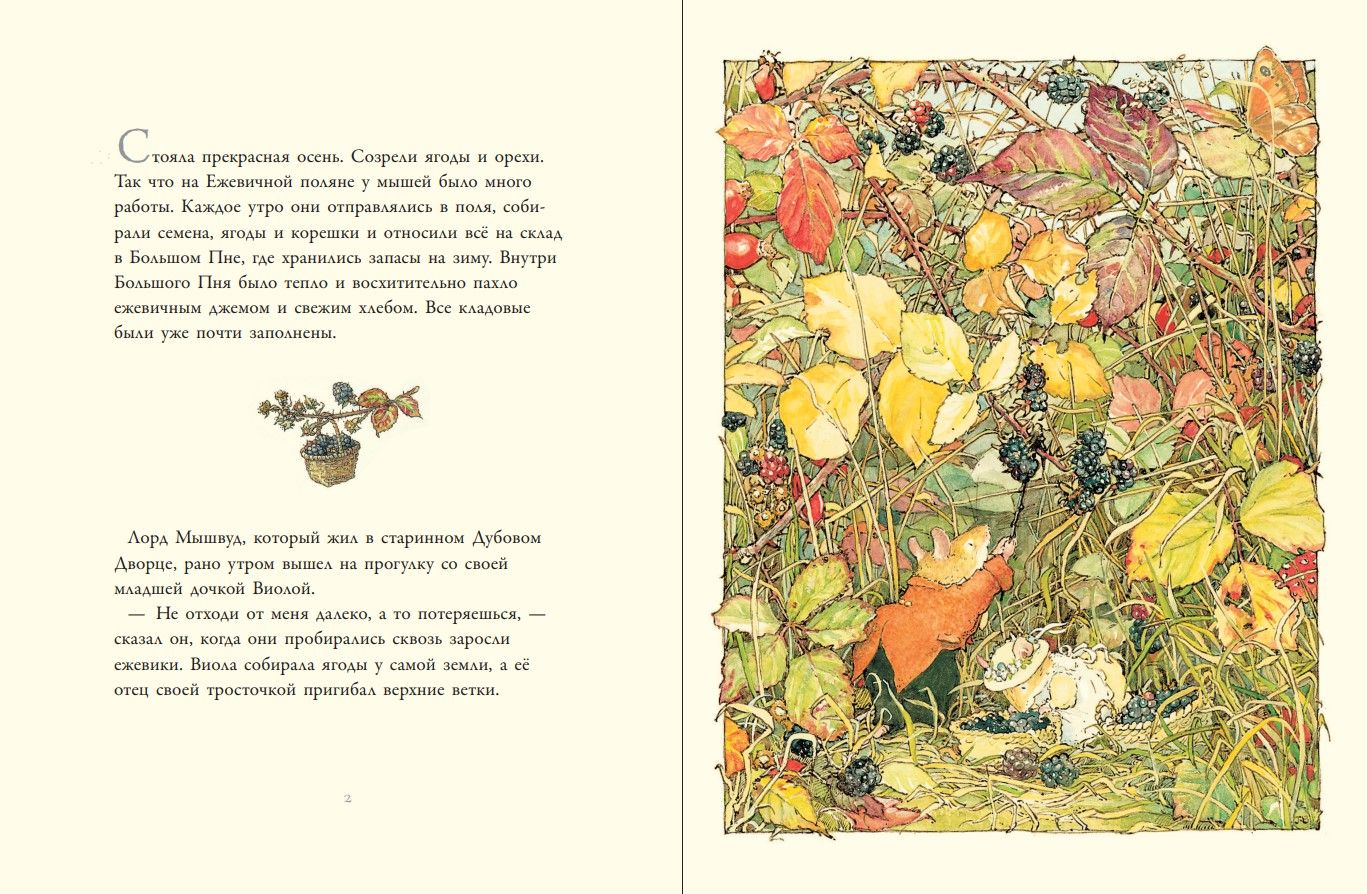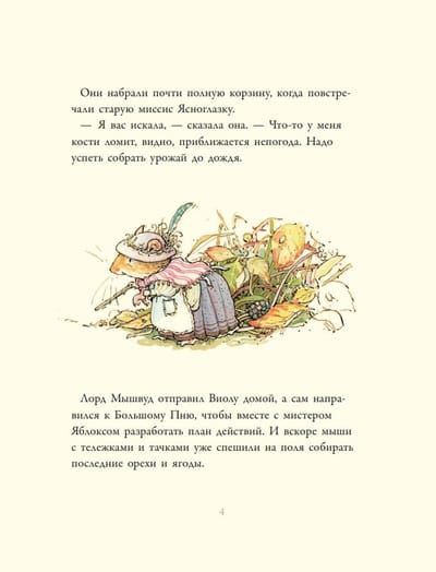 Вот и наступила осень! У мышей было много работы — ведь созрели ягоды и орехи, надо заполнить кладовые на зиму. Даже лорд и леди Мышвуд помогают в сборе. А их дочка Виола пока решила прогуляться по краю поля, но так увлеклась, что заблудилась. Все мыши сбились с лап,