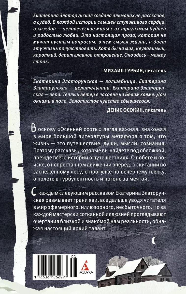 В основу «Осенней охоты» легла важная, знакомая в мире большой литературы метафора о том, что жизнь – это путешествие: души, мысли, сознания. Поэтому рассказы, которые вы найдете под обложкой, прежде всего истории о путешествиях. О побеге и поиске, о непрестанном движении вперед, о скитании по заснеженному лесу, о прогулке по вечернему пляжу, о полете в турбулентность и погоне за мечтой. С каждым следующим рассказом Екатерина Златорунская размывает грани яви, все дальше уводя читателя в мир эфемерного, иллюзорного, несбыточного. Но за каждой мастерски сотканной иллюзией проглядывают очертания близкой и знакомой нам реальности, обнажая настоящий, яркий талант.
