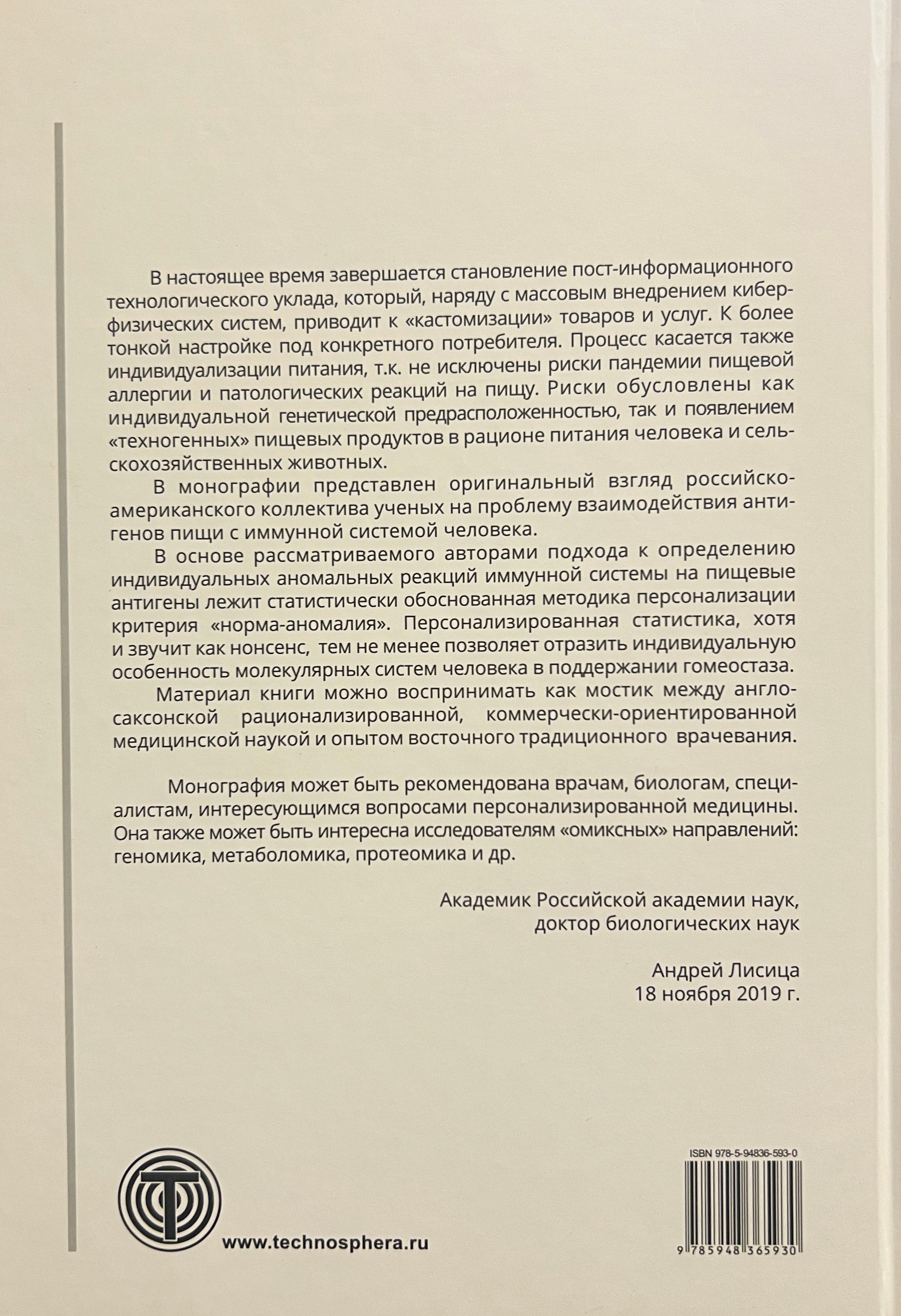 «Основы иммунодиетологии» - это уникальная книга, представляющая оригинальный подход к взаимодействию антигенов пищи с иммунной системой человека, разработанный российско-американским коллективом ученых. Авторы данной монографии предлагают методику персонализации критерия «норма-аномалия» на основе персонализированной статистики, отражающей индивидуальные особенности молекулярных систем человека.