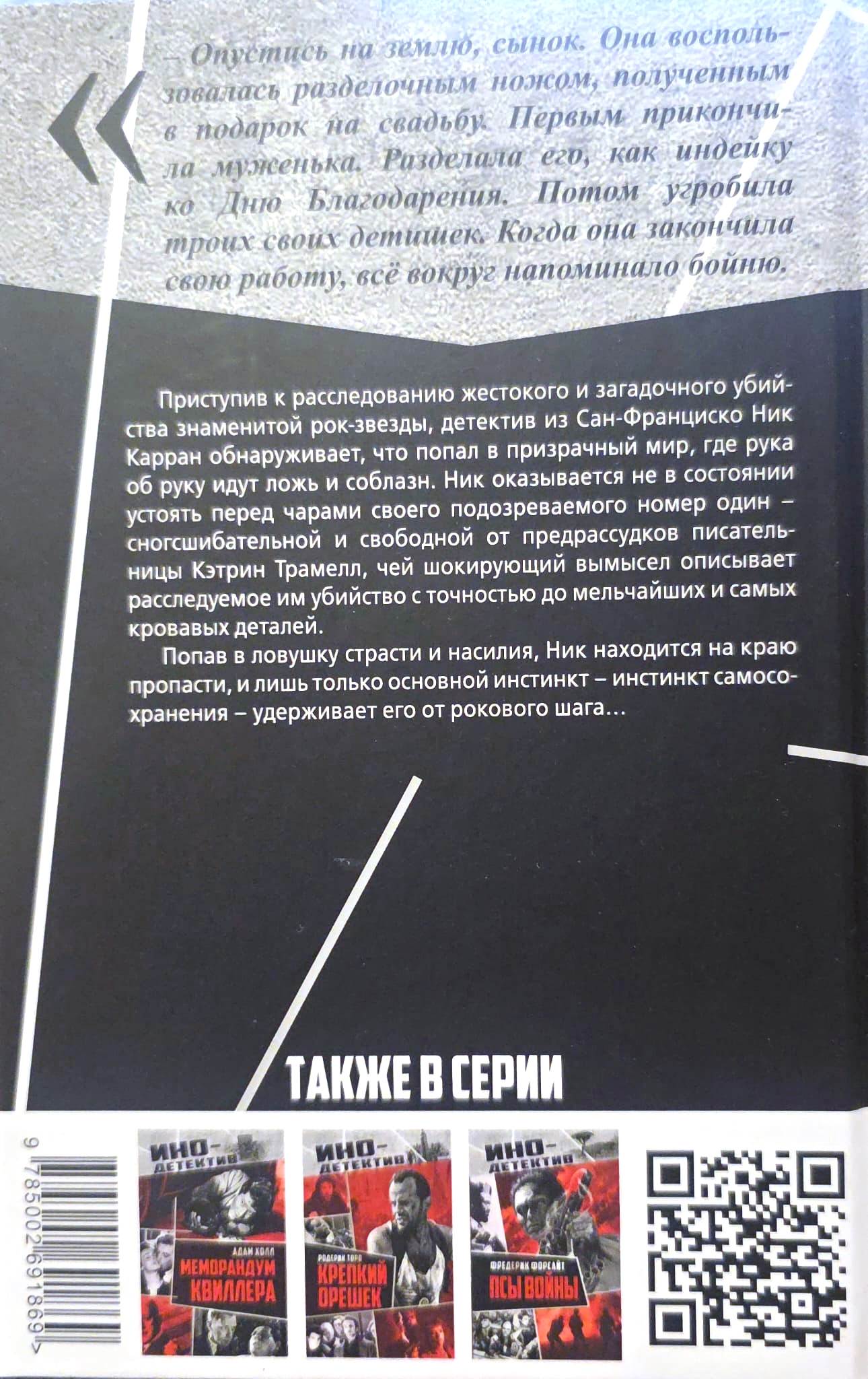 Приступив к расследованию жестокого и загадочного убийства знаменитой рок-звезды, детектив из Сан-Франциско Ник Карран обнаруживает, что попал в призрачный мир, где рука об руку идут ложь и соблазн. Ник оказывается не в состоянии устоять перед чарами своего подозреваемого номер один – сногсшибательной и свободной от предрассудков писательницы Кэтрин Трамелл, чей шокирующий вымысел описывает расследуемое им убийство с точностью до мельчайших и самых кровавых деталей. Попав в ловушку страсти и насилия, Ник находится на краю пропасти, и лишь только основной инстинкт – инстинкт самосохранения - удерживает его от рокового шага…