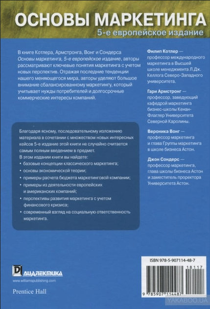 Новое издание «Основ маркетинга» (европейское издание), написанное основателем науки маркетинга Филипом Котлером в соавторстве с Гари Армстронгом, Джоном Сондерсом и Вероникой Вонг, содержит основные положения теории маркетинга и примеры, взятые из деятельности европейских компаний. Наряду с базовыми сведениями читатель получит информацию о новых методических разработках в маркетинге и узнает, как меняется маркетинг с развитием технологий и изменением финансовой ситуации в мире. Кроме того, авторы рассказывают о маркетинге в Интернете и с помощью мобильной связи, о новых разработках в менеджменте продаж, приводят примеры составления бюджета маркетинга организации, объясняют, как используется в маркетинге (особенно в рекламе) статистика и психология. В последние годы общество предъявляет все более высокие требования как к производителям товаров, так и к продавцам, и маркетинг, реагируя на изменившиеся запросы, становится все более социально ориентированным. Книга рассчитана на широкий круг читателей, в особенности изучающих маркетинг, рекламу, менеджмент. 5-е европейское издание.