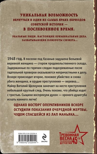 1948 год. В поселке под Казанью задушена бельевой веревкой женщина — сторож продовольственного склада. Задержанные по горячим следам подозреваемые после тщательной проверки оказываются непричастными к делу. Вскоре происходит второе похожее убийство: и снова убита женщина, и орудие преступления — веревка… Майор Виталий Щелкунов замечает на месте преступления небольшой круглый след. Очень похоже, что убийца ходит с тростью. Сыщики воспряли духом — хромого душегуба искать намного легче! Однако восторг оперативников вскоре остудили показания очередной жертвы, чудом спасшейся из лап маньяка…