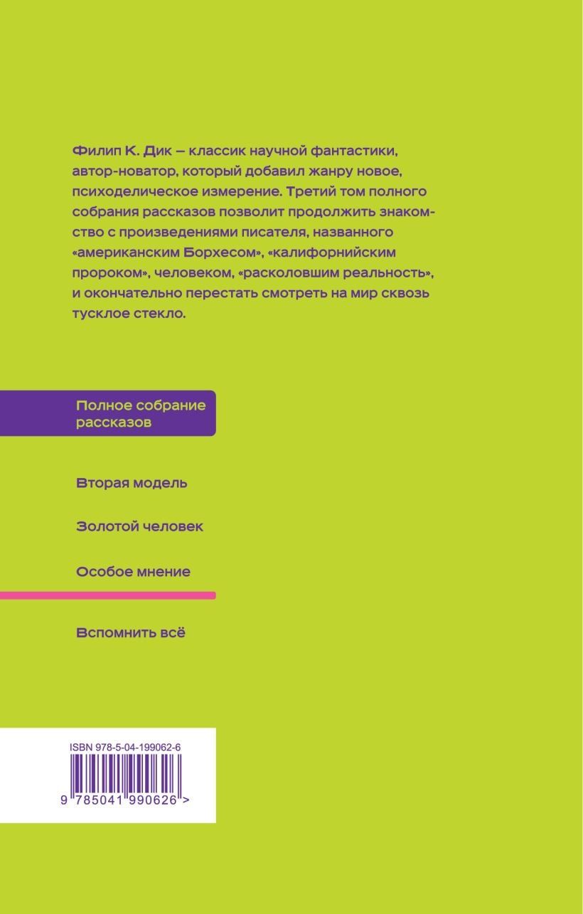 Филип К. Дик — классик научной фантастики, автор-новатор, который добавил жанру новое психоделическое измерение. Третий том полного собрания рассказов позволит продолжить знакомство с произведениями писателя, названного «американским Борхесом», «калифорнийским пророком», человеком, «расколовшим реальность», и окончательно перестать смотреть на мир сквозь тусклое стекло. Часть произведений сопровождаются авторскими комментариями. Специально для этого издания выполнен новый перевод.