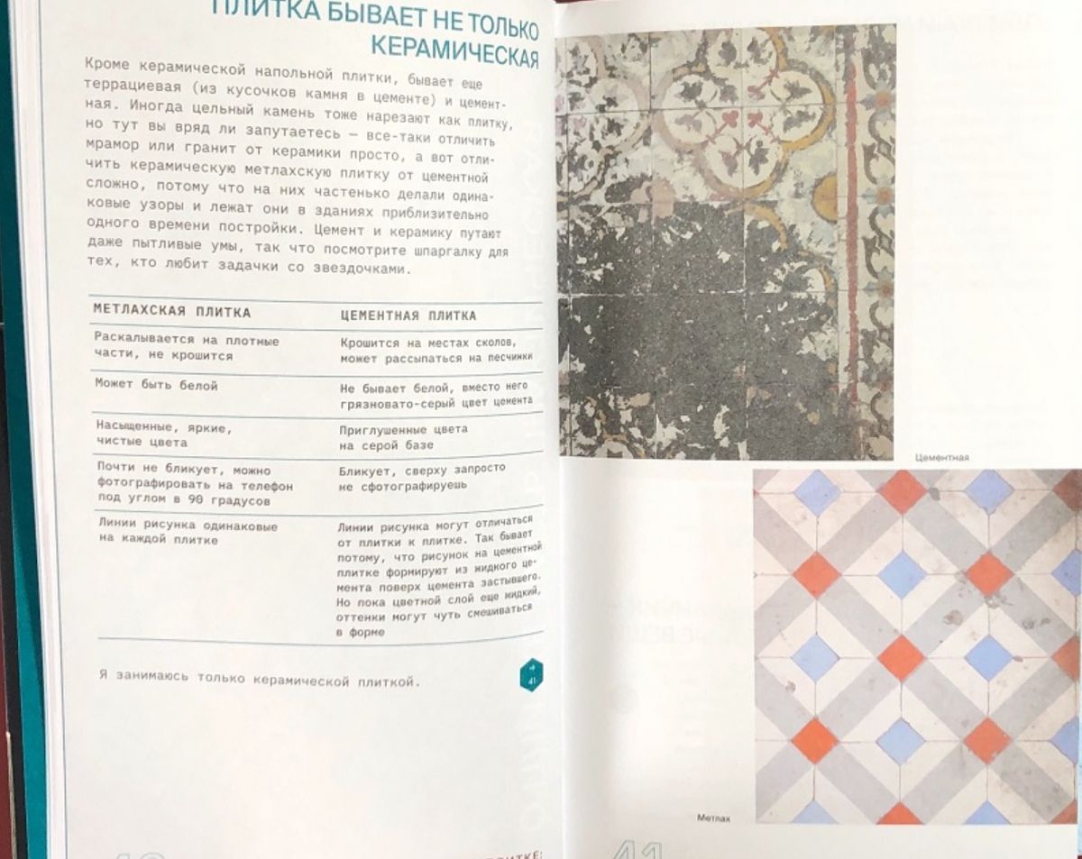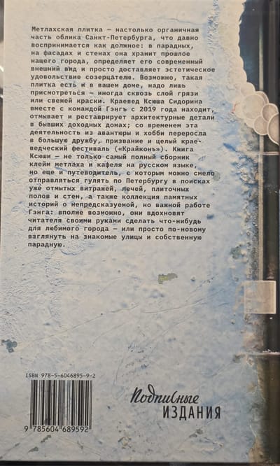 Метлахская плитка — настолько органичная часть облика Санкт-Петербурга, что давно воспринимается как должное: в парадных, на фасадах и стенах она хранит прошлое нашего города, определяет его современный внешний вид и просто доставляет эстетическое удовольствие созерцателю. Возможно, такая плитка есть и в вашем доме, надо лишь присмотреться — иногда сквозь слой грязи или свежей краски. Краевед Ксюша Сидорина вместе с командой Гэнгъ с 2019 года находит, отмывает и реставрирует архитектурные детали в бывших доходных домах; со временем эта деятельность из авантюры и хобби переросла в большую дружбу, призвание и целый краеведческий фестиваль («Крайконъ»). Книга Ксюши — не только самый полный сборник клейм метлаха и кафеля на русском языке, но еще и путеводитель, с которым можно смело отправляться гулять по Петербургу в поисках уже отмытых витражей, печей, плиточных полов и стен, а также коллекция памятных историй о непредсказуемой, но важной работе Гэнга: вполне возможно, они вдохновят читателя своими руками сделать что-нибудь для любимого города — или просто по-новому взглянуть на знакомые улицы и собственную парадную.