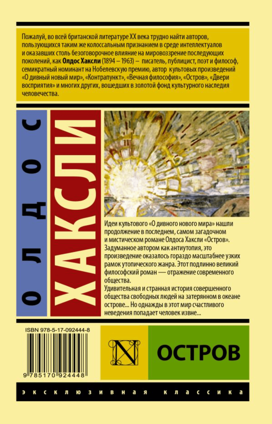 Идеи культового «О дивного нового мира» нашли продолжение в последнем, самом загадочном и мистическом романе Олдоса Хаксли «Остров». Задуманное автором как антиутопия, это произведение оказалось гораздо масштабнее узких рамок утопического жанра. Этот подлинно великий философский роман — отражение современного общества.
