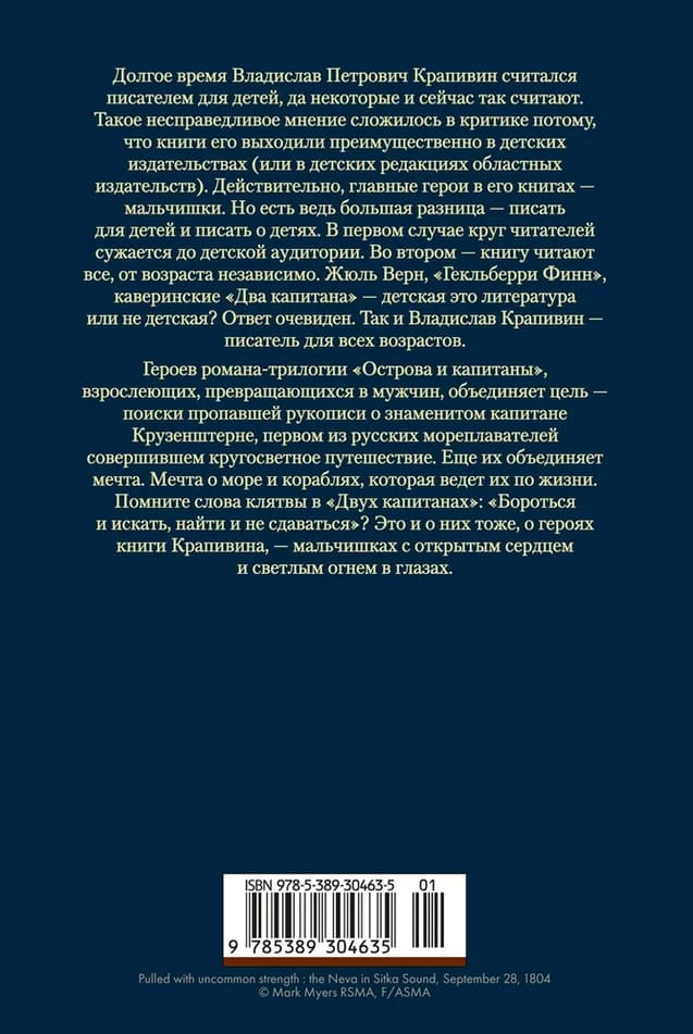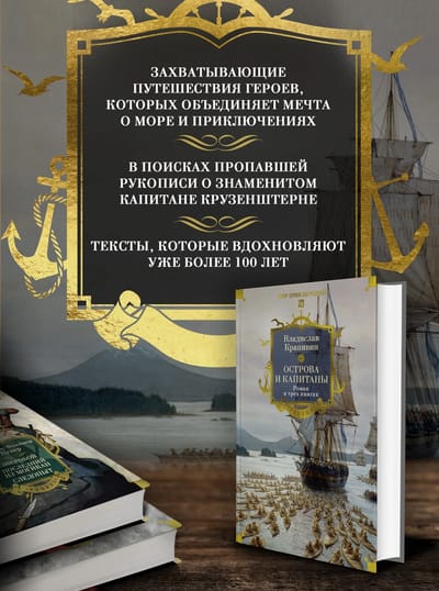 Героев романа-трилогии «Острова и капитаны», взрослеющих, превращающихся в мужчин, объединяет цель — поиски пропавшей рукописи о знаменитом капитане Крузенштерне, первом из русских мореплавателей совершившем кругосветное путешествие. Еще их объединяет мечта. Мечта о море и кораблях, которая ведет их по жизни. Помните слова клятвы в «Двух капитанах»: «Бороться и искать, найти и не сдаваться»? Это и о них тоже, о героях книги Крапивина, — мальчишках с открытым сердцем и светлым огнем в глазах.