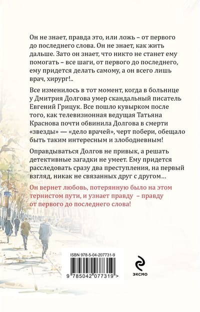 Он не знает, правда это, или ложь – от первого до последнего слова. Он не знает, как жить дальше. Зато он знает, что никто не станет ему помогать – все шаги, от первого до последнего, ему придется делать самому, а он всего лишь врач, хирург!.. Все изменилось в тот момент, когда в больнице у Дмитрия Долгова умер скандальный писатель Евгений Грицук. Все пошло кувырком после того, как телевизионная ведущая Татьяна Краснова почти обвинила Долгова в смерти «звезды» - «дело врачей», черт побери, обещало быть таким интересным и злободневным! Оправдываться Долгов не привык, а решать детективные загадки не умеет. Ему придется расследовать сразу два преступления, на первый взгляд, никак не связанных друг с другом… Он вернет любовь, потерянную было на этом тернистом пути, и узнает правду – правду от первого до последнего слова!