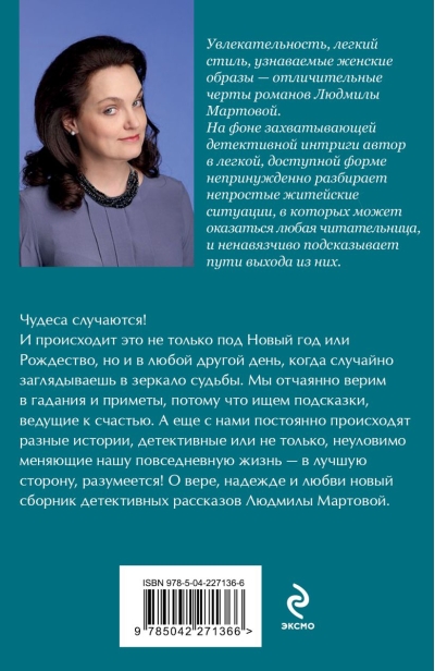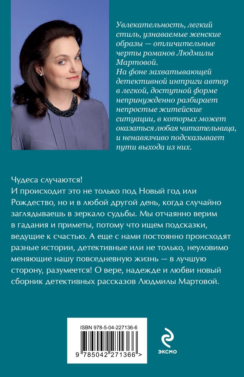 Чудеса случаются! И происходит это не только под Новый год или Рождество, но и в любой другой день, когда случайно заглядываешь в зеркало судьбы. Мы отчаянно верим в гадания и приметы, потому что ищем подсказки, ведущие к счастью. А еще с нами постоянно происходят разные истории, детективные или не только, неуловимо меняющие нашу повседневную жизнь — в лучшую сторону, разумеется!О вере, надежде и любви новый сборник детективных рассказов Людмилы Мартовой.Увлекательность, легкий стиль, узнаваемые женские образы, лирические отступления — отличительные черты рассказов Людмилы Мартовой. На фоне захватывающей детективной интриги автор в легкой доступной форме непринужденно разбирает непростые житейские ситуации, в которых может оказаться любая читательница, и ненавязчиво подсказывает пути выхода из них.