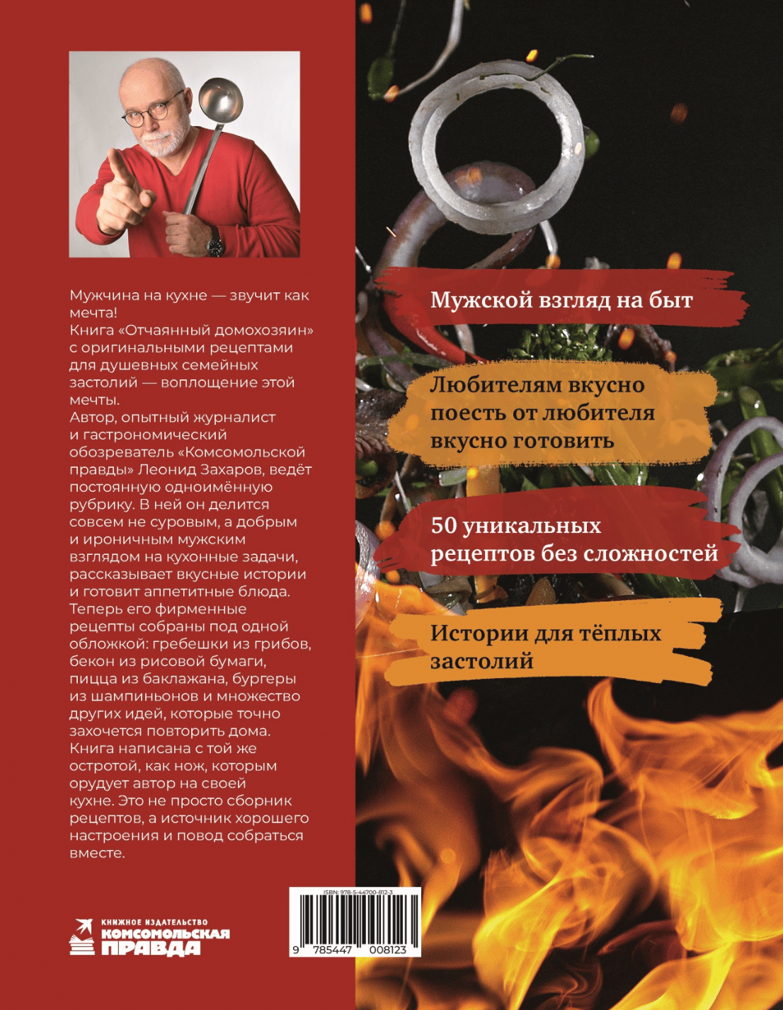 Мужчина на кухне — звучит как мечта! Книга «Отчаянный домохозяин» с оригинальными рецептами для душевных семейных застолий — воплощение этой мечты. Автор, опытный журналист и гастрономический обозреватель Леонид Захаров, ведет постоянную одноименную рубрику. В ней он делится совсем не суровым, а добрым и ироничным мужским взглядом на кухонные задачи, рассказывает вкусные истории и готовит аппетитные блюда. Теперь его фирменные рецепты собраны под одной обложкой: гребешки из грибов, бекон из рисовой бумаги, пицца из баклажана, бургеры из шампиньонов и множество других идей, которые точно захочется повторить дома. Книга написана с той же остротой, как нож, которым орудует автор на своей кухне. Это не просто сборник рецептов, а источник хорошего настроения и повод собраться вместе.