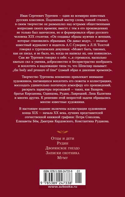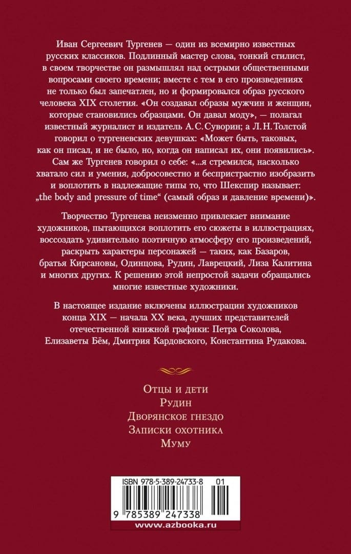 Иван Сергеевич Тургенев — один из всемирно известных русских классиков. Подлинный мастер слова, тонкий стилист, в своем творчестве он размышлял над острыми общественными вопросами своего времени; вместе с тем в его произведениях не только был запечатлен, но и формировался образ русского человека XIX столетия. «Он создавал образы мужчин и женщин, которые становились образцами. Он давал моду», — полагал известный журналист и издатель А. С. Суворин; а Л. Н.Толстой говорил о тургеневских девушках: «Может быть, таковых, как он писал, и не было, но, когда он написал их, они появились». Сам же Тургенев говорил о себе: «…я стремился, насколько хватало сил и умения, добросовестно и беспристрастно изобразить и воплотить в надлежащие типы то, что Шекспир называет: «the body and pressure of time» (самый образ и давление времени)». В настоящее издание вошли такие произведения, как «Отцы и дети», «Рудин», «Дворянское гнездо», «Записки охотника», «Муму». Они печатаются в сопровождении иллюстраций выдающихся мастеров книжной графики — П. Соколова, Е. Бём, Д. Кардовского, К. Рудакова.