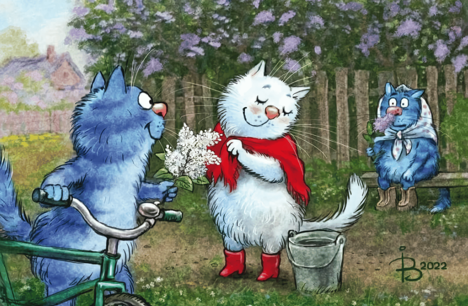 Открытка. Синие коты. Белая сирень
