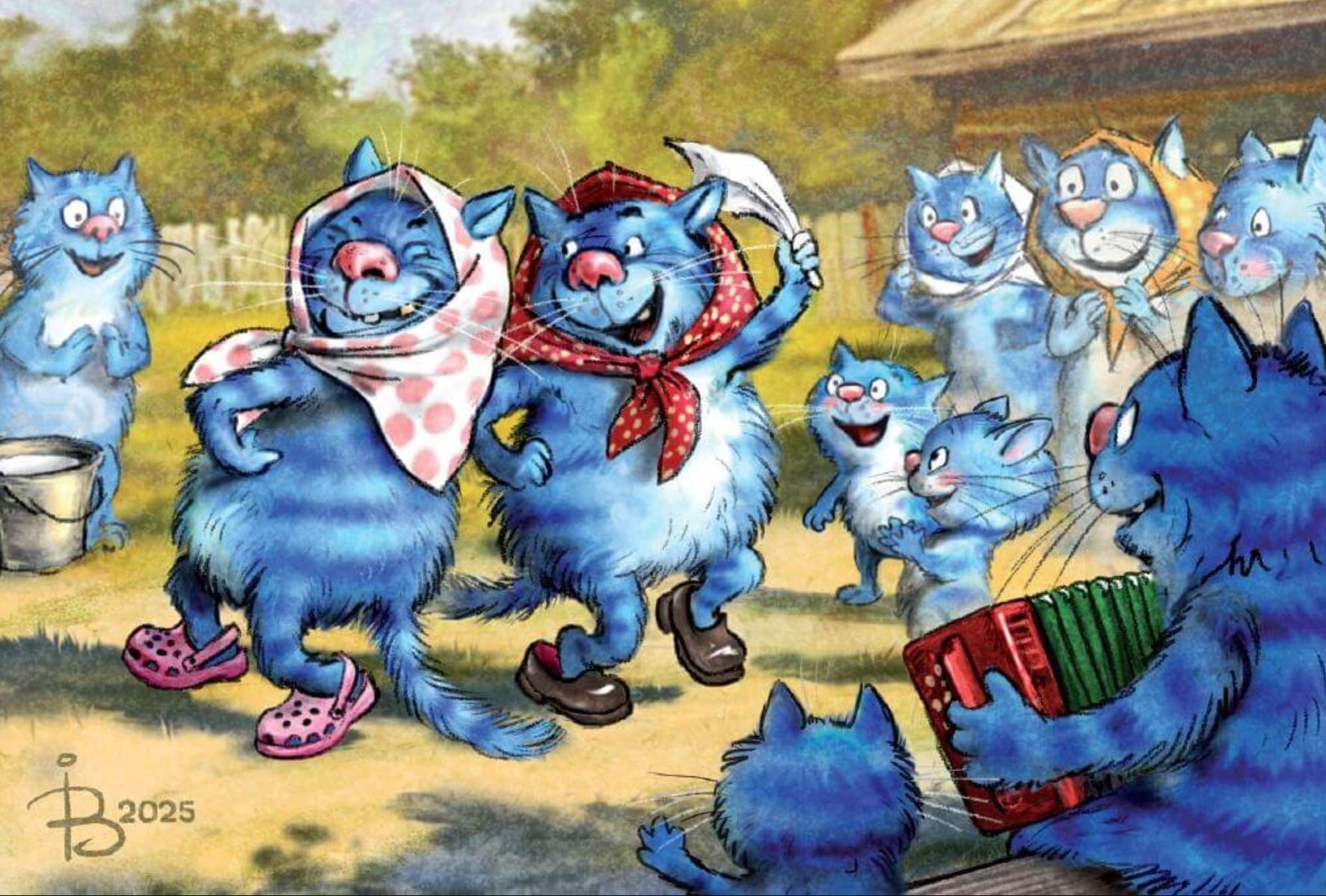 Открытка. Синие коты. Деревенские пляски