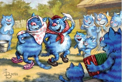 Красивая и забавная почтовая открытка с синими котами обязательно понравится получателю, поскольку рисунки Ирины Зенюк очень милые и продуманы до мелочей.
