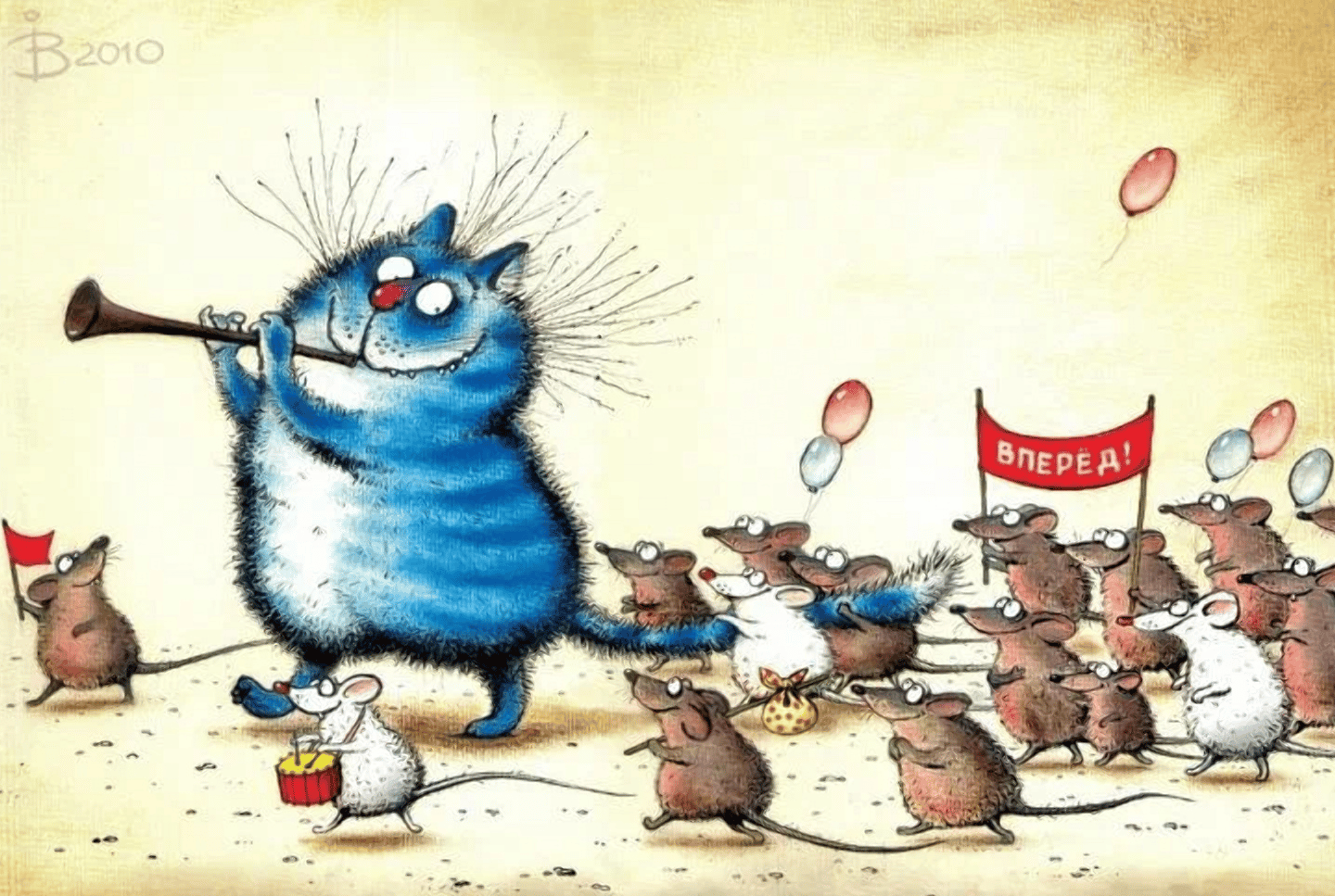 Красивая и забавная почтовая открытка с синими котами обязательно понравится получателю, поскольку рисунки Ирины Зенюк очень милые и продуманы до мелочей.