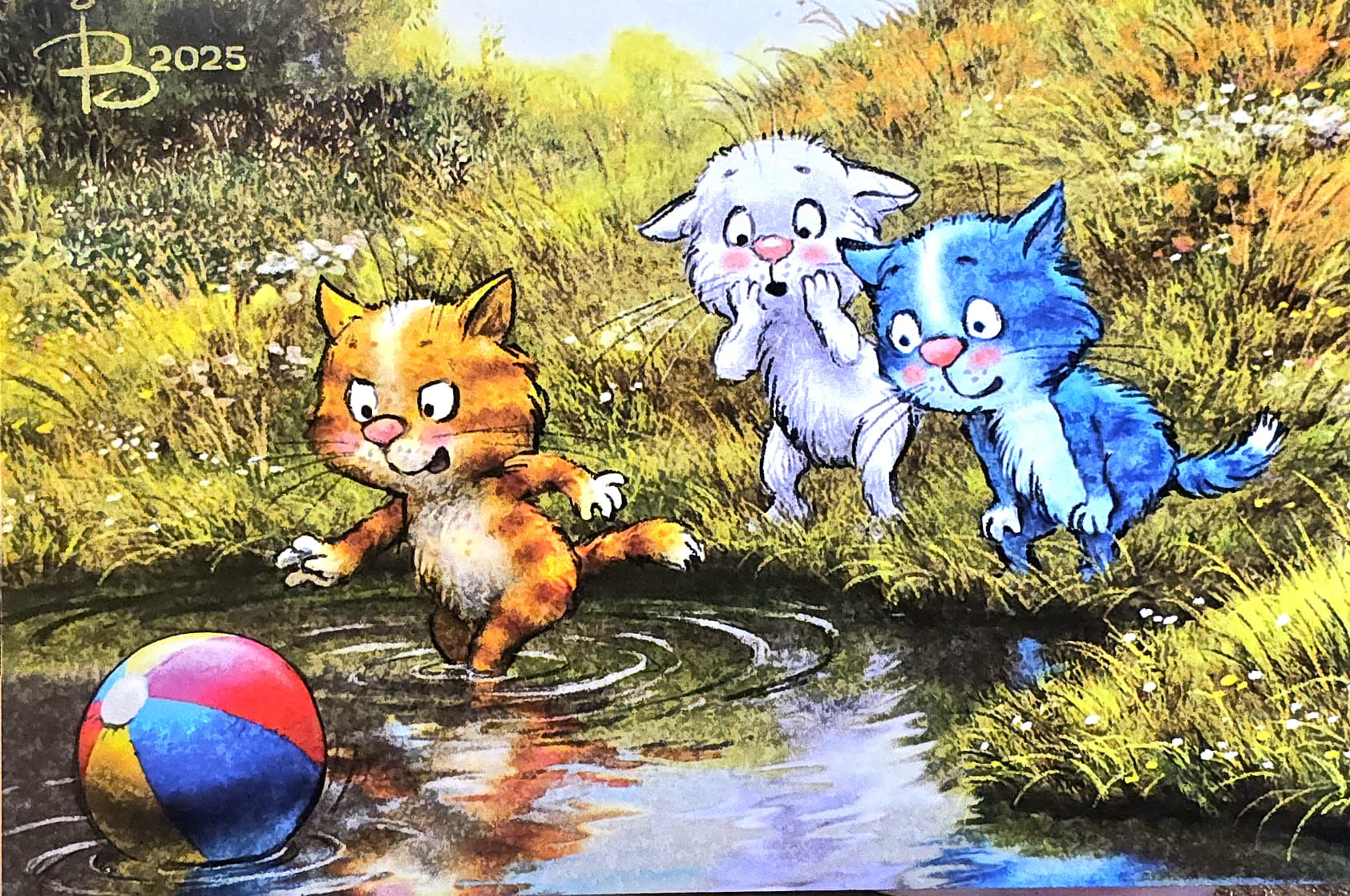 Открытка. Синие коты. Уронили в речку мяч