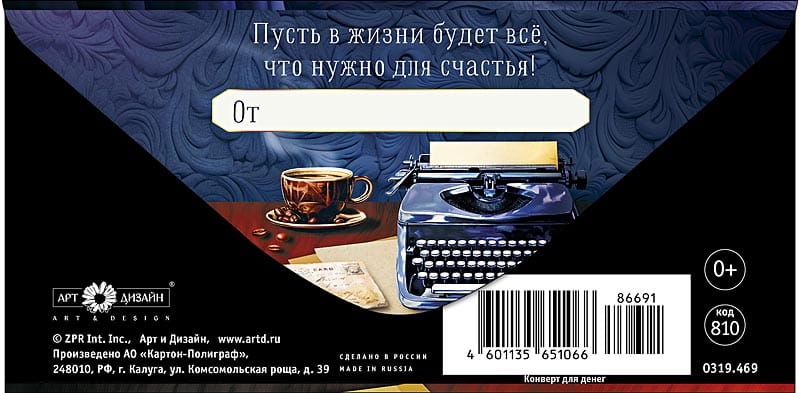 Конверт для денег с рисунком и текстом на обороте: «Пусть в жизни будет все, что нужно для счастья!».