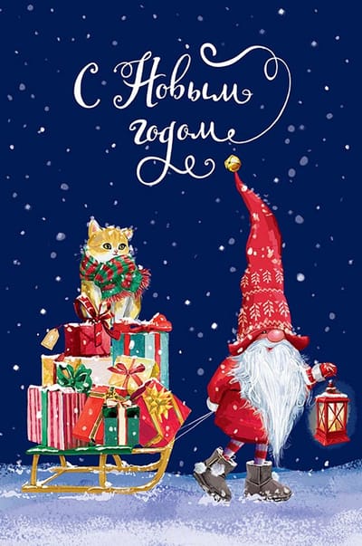 Открытка. С Новым годом. Дед Мороз и котик с санями подарков