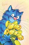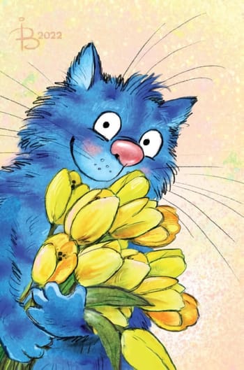 Открытка. Синие коты. Кот с букетом тюльпанов