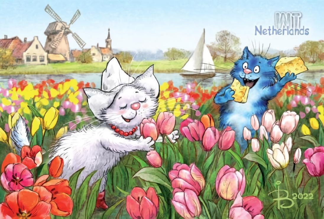 Открытка. Синие коты. Коты путешествуют. Нидерланды