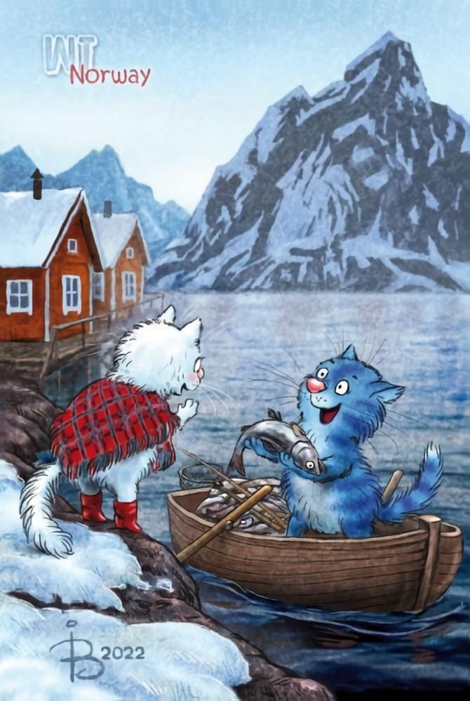 Открытка. Синие коты. Коты путешествуют. Норвегия