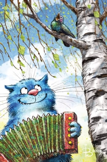 Красивая и забавная почтовая открытка с синими котами обязательно понравится получателю, поскольку рисунки Ирины Зенюк очень милые и продуманы до мелочей.