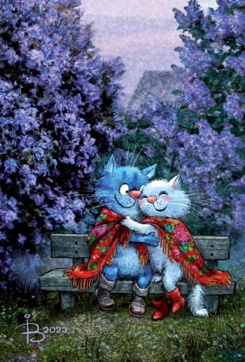 Красивая и забавная почтовая открытка с синими котами обязательно понравится получателю, поскольку рисунки Ирины Зенюк очень милые и продуманы до мелочей.