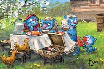 Открытка. Синие коты. В гостях у бабушки и дедушки