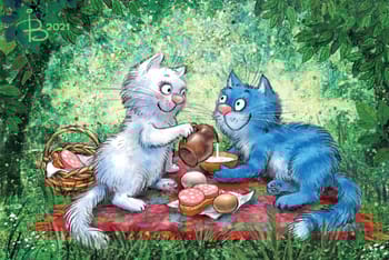 Открытка. Синие коты. Завтрак на траве