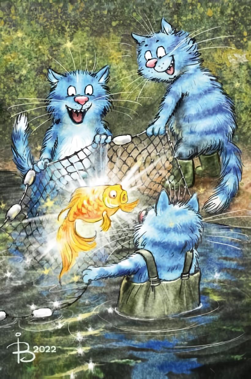 Открытка. Синие коты. Золотая рыбка