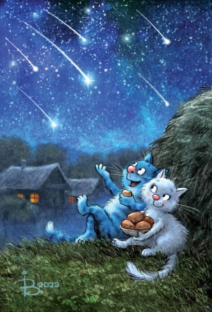 Красивая и забавная почтовая открытка с синими котами обязательно понравится получателю, поскольку рисунки Ирины Зенюк очень милые и продуманы до мелочей.