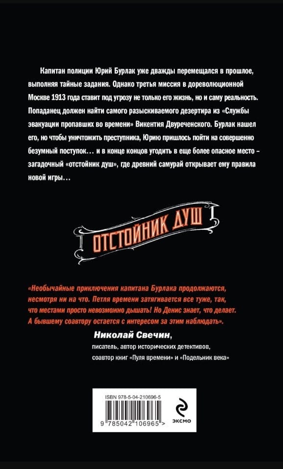 Капитан полиции Юрий Бурлак уже дважды перемещался в прошлое, выполняя тайные задания. Однако третья миссия в дореволюционной Москве 1913 года ставит под угрозу не только его жизнь, но и саму реальность. Попаданец должен найти самого разыскиваемого дезертира из «Службы эвакуации пропавших во времени» Викентия Двуреченского. Бурлак нашел его, но чтобы уничтожить преступника, Юрию пришлось пойти на совершенно безумный поступок… и в конце концов угодить в еще более опасное место – загадочный «отстойник душ», где древний самурай открывает ему правила новой игры…