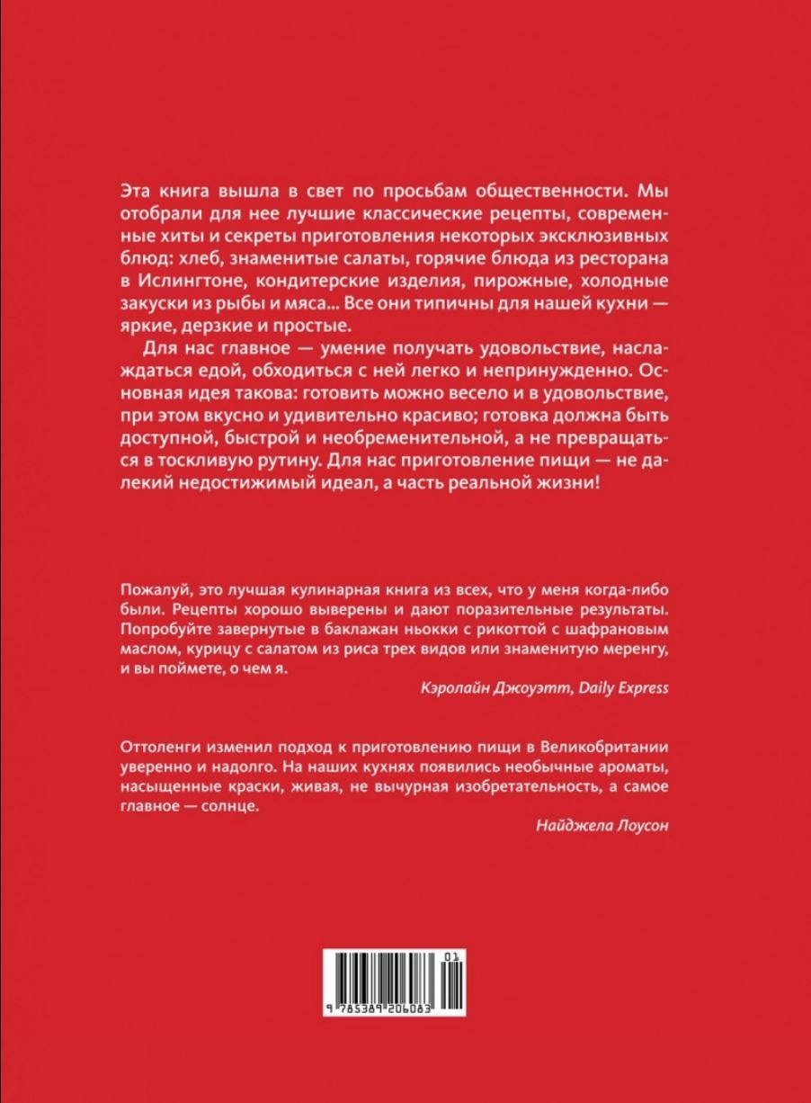 Обновленное и дополненное издание знаменитой поваренной книги Йотама Оттоленги и Сами Тамими, ставшей классикой гастрономической литературы. В основе 140 эффектных, аппетитных и несложных в приготовлении блюд — от мяса, рыбы и роскошных салатов до восхитительных десертов и выпечки — лежат кулинарные традиции со всего мира, от Ближнего Востока до Северной Африки, от Италии до Калифорнии. Оригинальные вкусовые сочетания, цвет, нетривиальные приправы — все, чем славится кухня Оттоленги. «Мы с большой гордостью воздаем должное этим блюдам в оформлении, которое лучше согласуется с остальными нашими книгами. Мы хотели модернизировать внешний вид блюд и добавить вступления к рецептам, сохранив при этом особенную структуру оригинала. Очень надеемся, что книга понравится и давним, и новым нашим поклонникам». (Йотам Оттоленги, Сами Тамими)