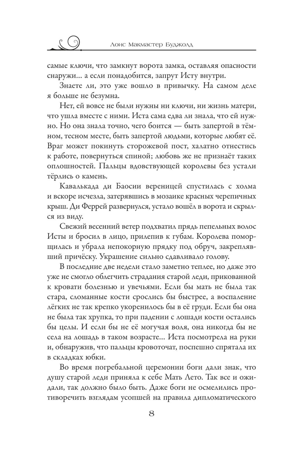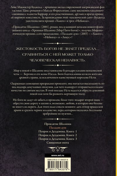 Мир и покой в Шалионе восстановлены благодаря усилиям венценосной четы Бергона и его жены Изелль. Боги благосклонны ко всем жителям древней страны, за исключением вдовствующей королевы Исты. Одержимая зловещими призраками прошлого, она пытается выскользнуть из-под надзора докучливых опекунов, для чего планирует отправиться в паломничество по святым местам. В этой поездке Иста надеется обрести душевный покой или хотя бы развеять мертвящую тоску. Но боги не дадут ей забыть о прошлом, более того: подарят второй шанс – обрести свою дорогу в жизни и, возможно, любовь, в которую она больше не имеет сил верить. Для этого надо совсем немного: дать отпор вражеской армии и сразить черное колдовство, перед которым оказались бессильны храбрейшие из мужчин...